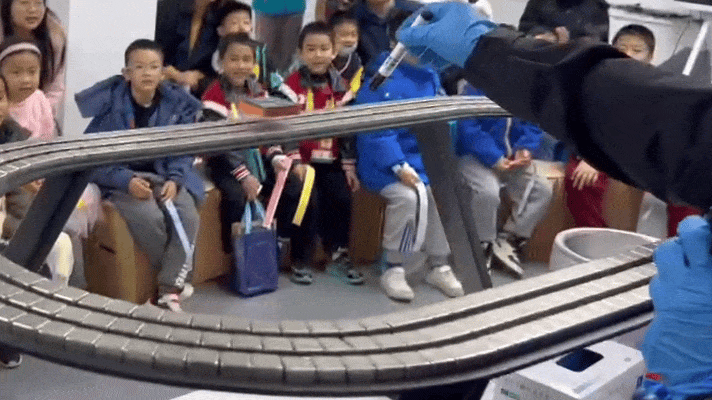 然后把它放到磁铁做的轨道上,可以看到超导体处于漂浮状态,一推它就开始不停地运动。